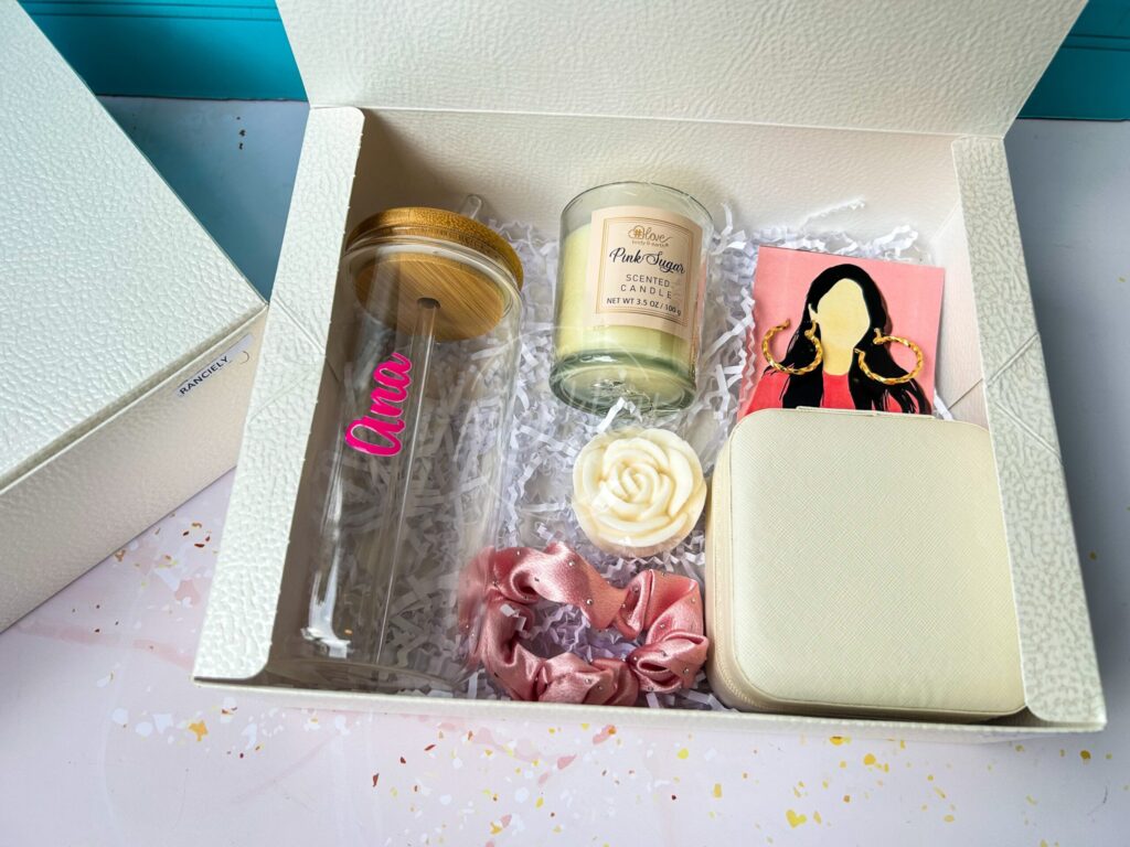 Vaso de cristal, scrunchie de gomita, aretes en base, jabón floral y joyero de viaje personalizado.