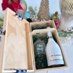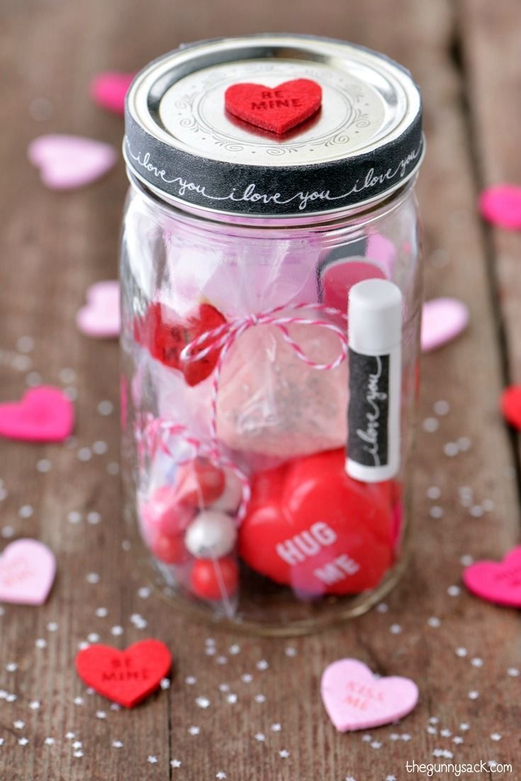 Jarra rellena con artículos mini spa decorados en tonos rojo y rosa.