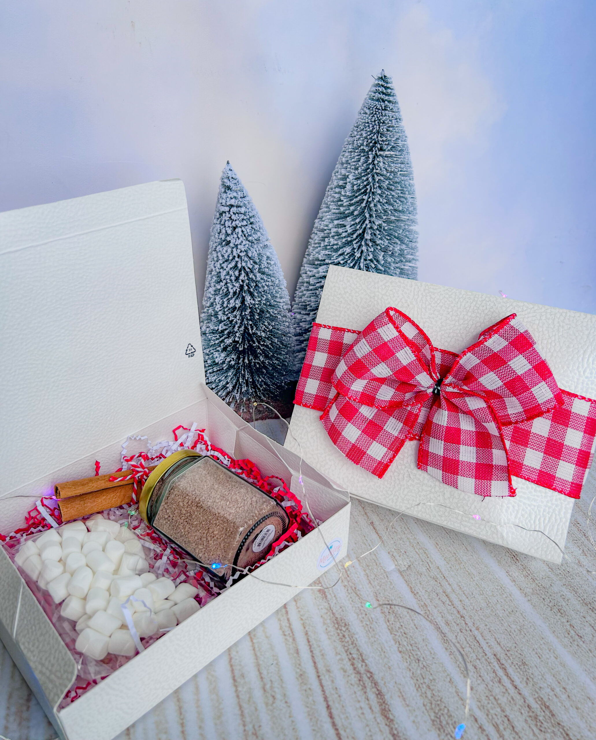 Cajita con chocolate instantáneo, cocoa, leche, canela y marshmallows.