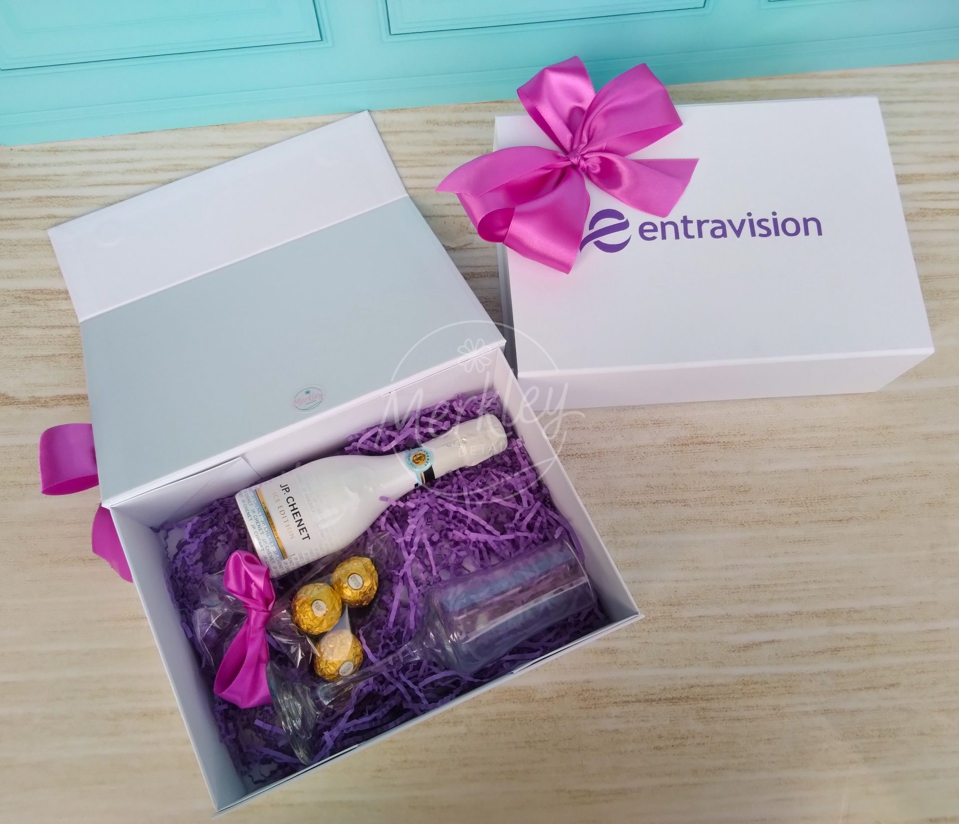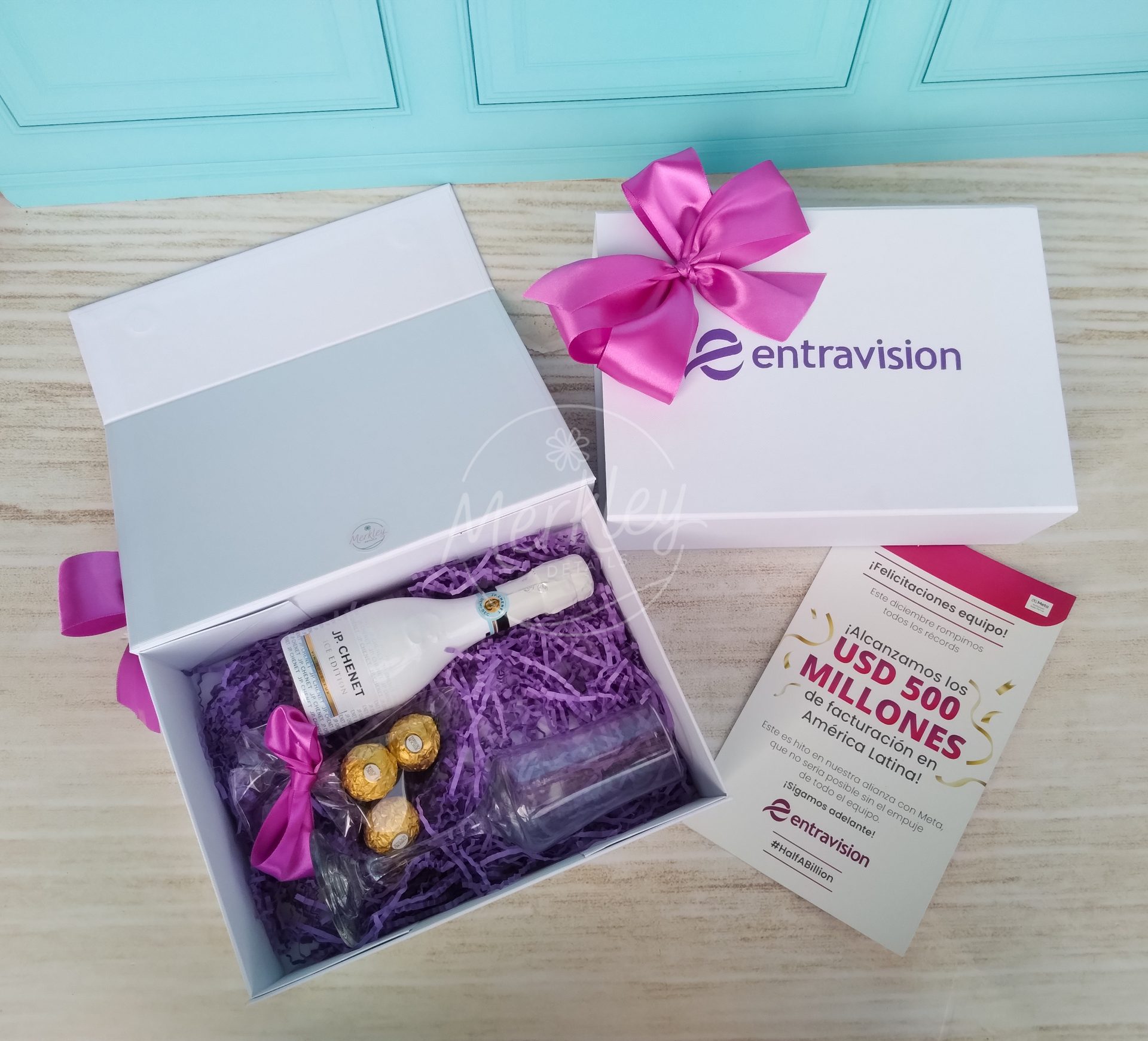 Caja dura imantada, mini espumoso, ferrero rocher y copa con tarjeta personalizada y caja personalizada