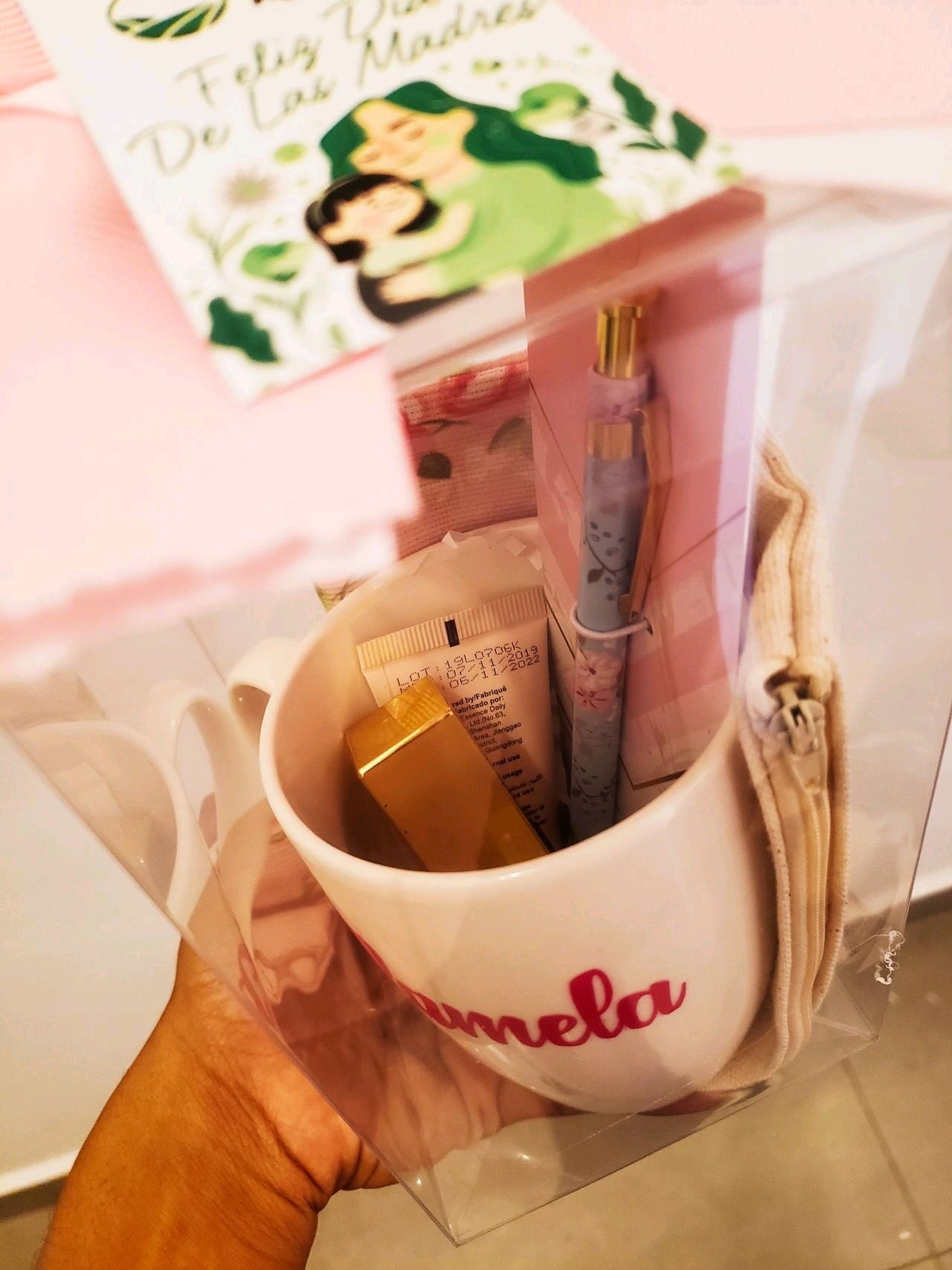 Tacita personalizada, lapicero femenino, crema de manos, brillo de labios y estuche de maquillaje.