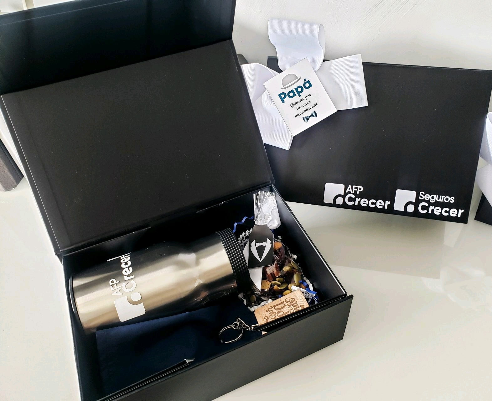 Caja dura, jarra térmica, bolsa de frutos secos, pañito de tela de bolsillo, y llavero de madera.