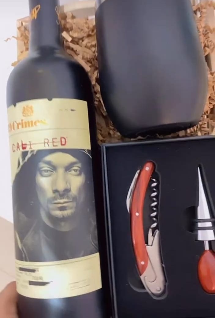 Caja con vino 19 crimes, vaso térmico y set descorchador.