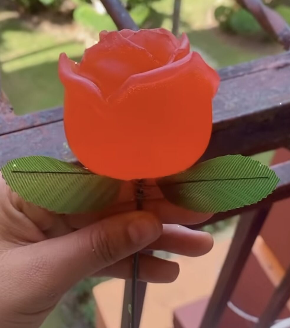 Flor jabón orgánica en bolsa de rosa y en forma de rosa.