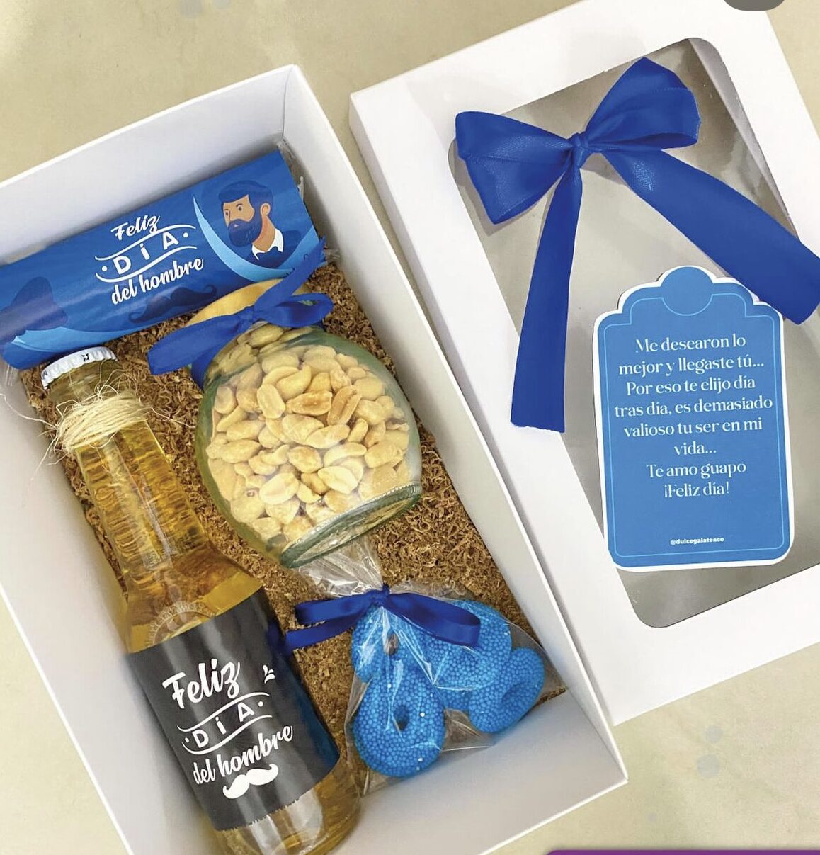 Cerveza, chocolate decorado, frasco de frutos secos y bolsita con gomitas dulces o galletas de mantequilla.