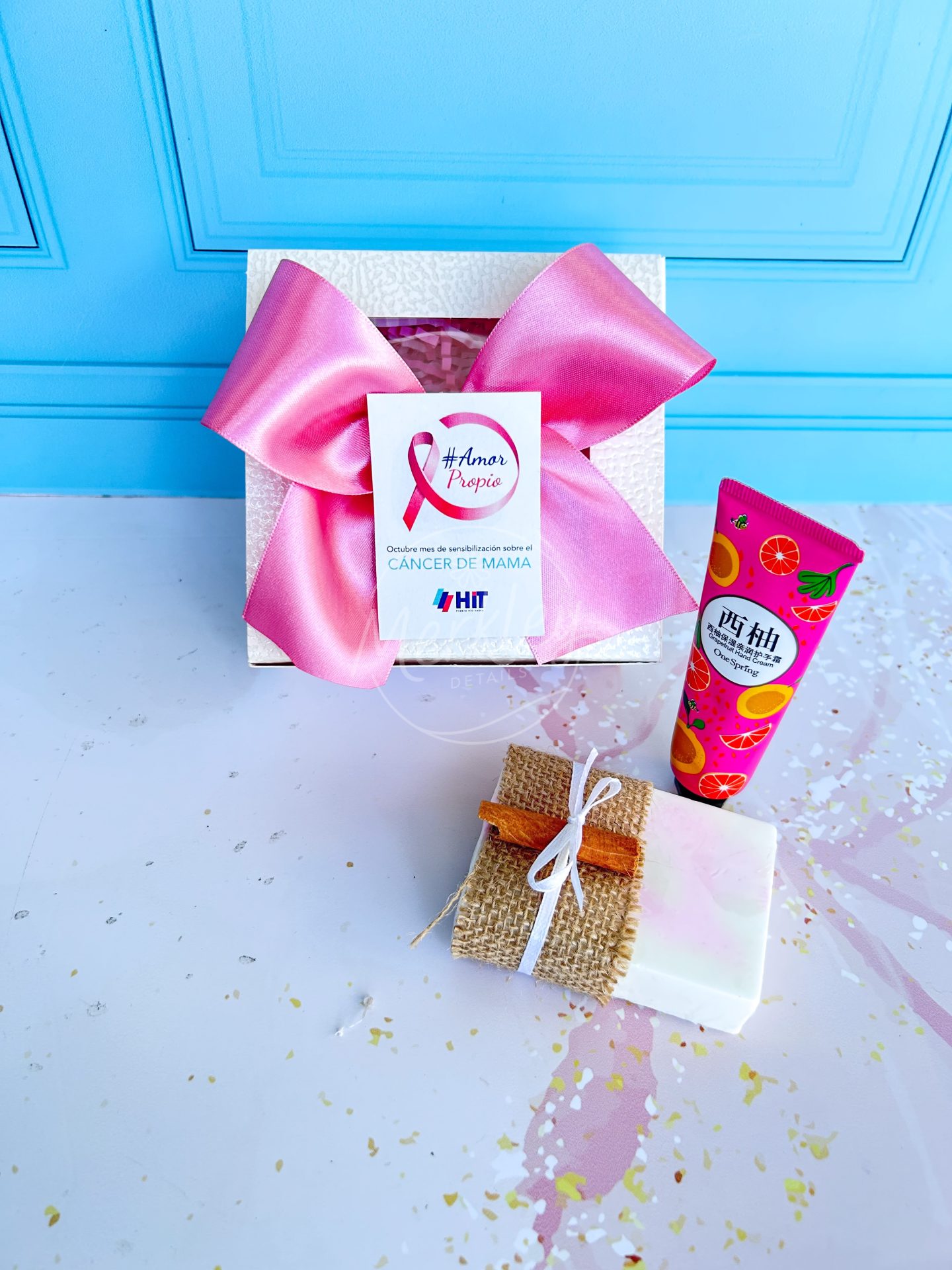 Cajita con jabón orgánico artesanal y crema de manos personalizadas.