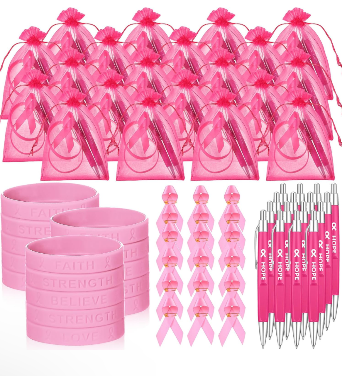 Set de pulsera de silicona, lapicero de metal y lazo de cáncer en cinta.