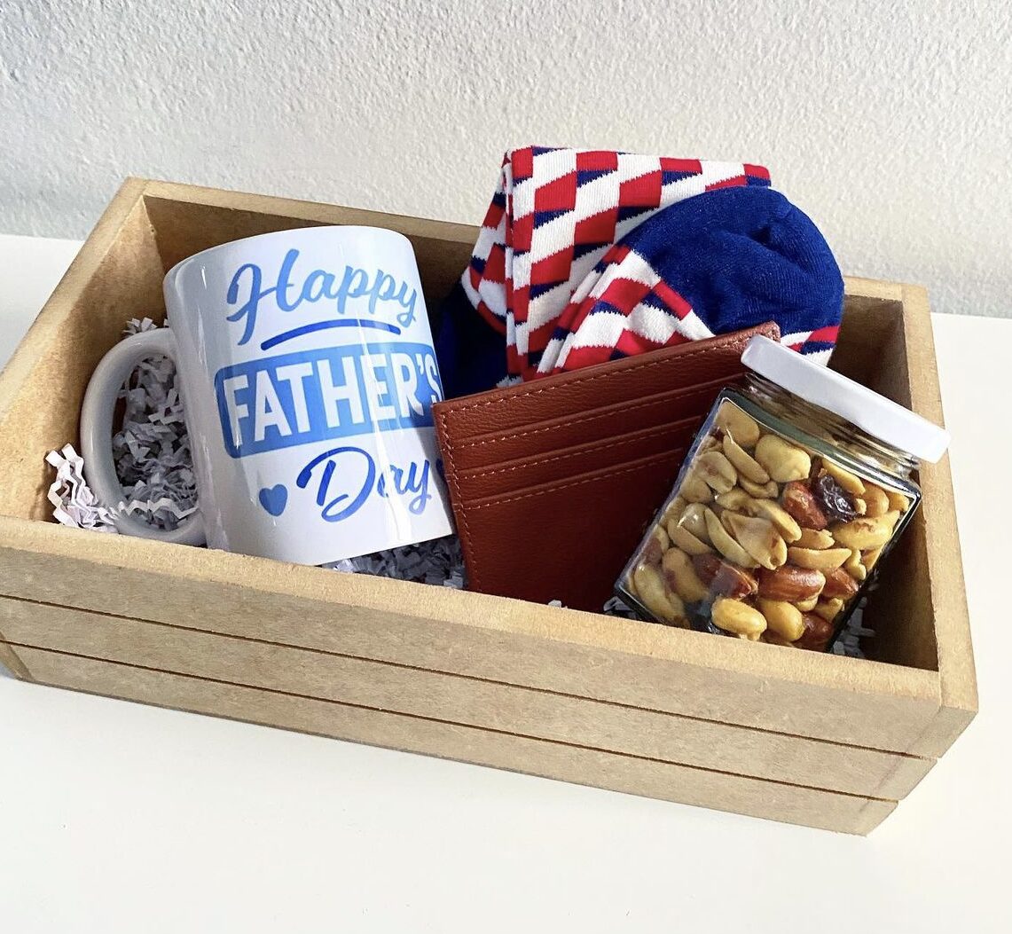 Taza personalizada, medias, portatarjeta y frasco de frutos secos en cesta de madera.