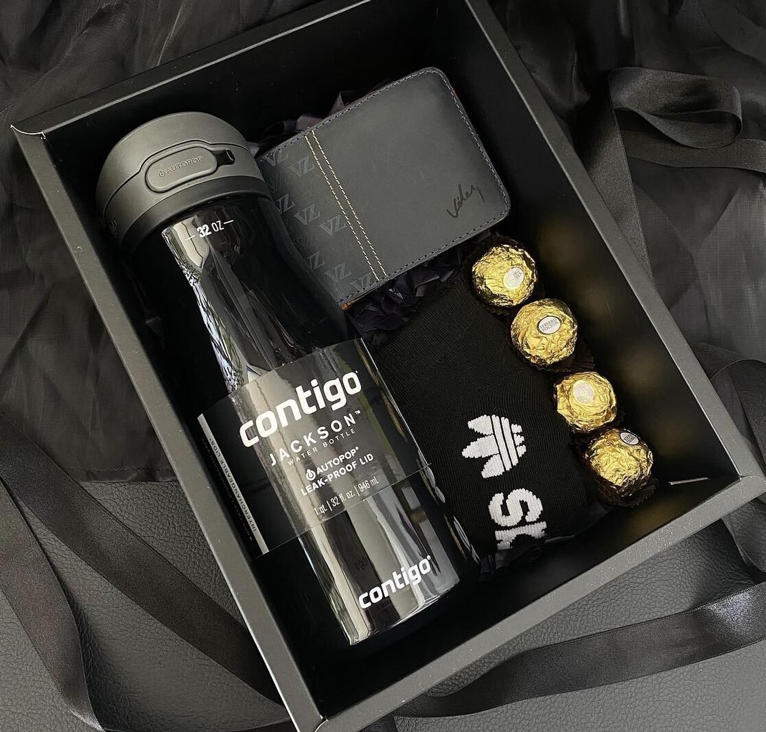 Termo térmico, bombones, set de medias, y cartera de hombre.
