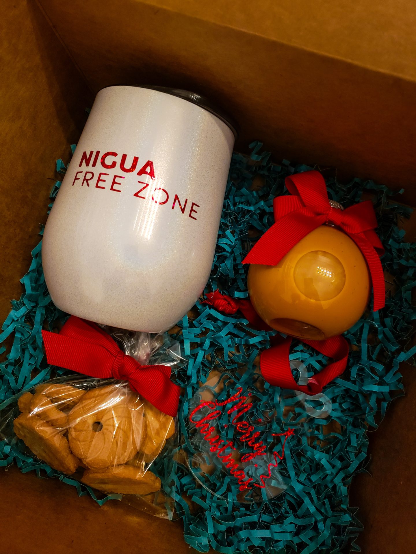 Set con vaso térmico, mini ponche, galletas navideñas y esfera navideña personalizada.