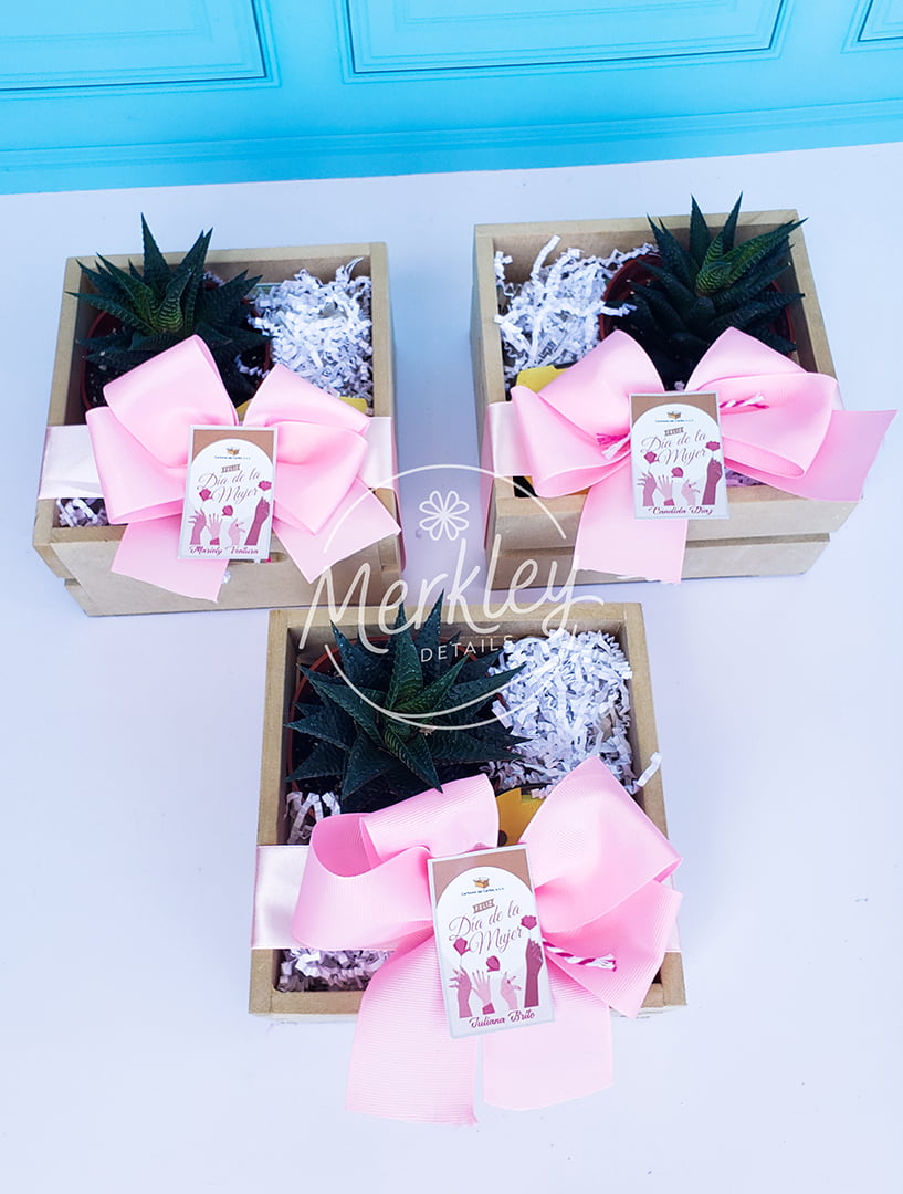 Cesta de madera, suculenta y vela aromática.