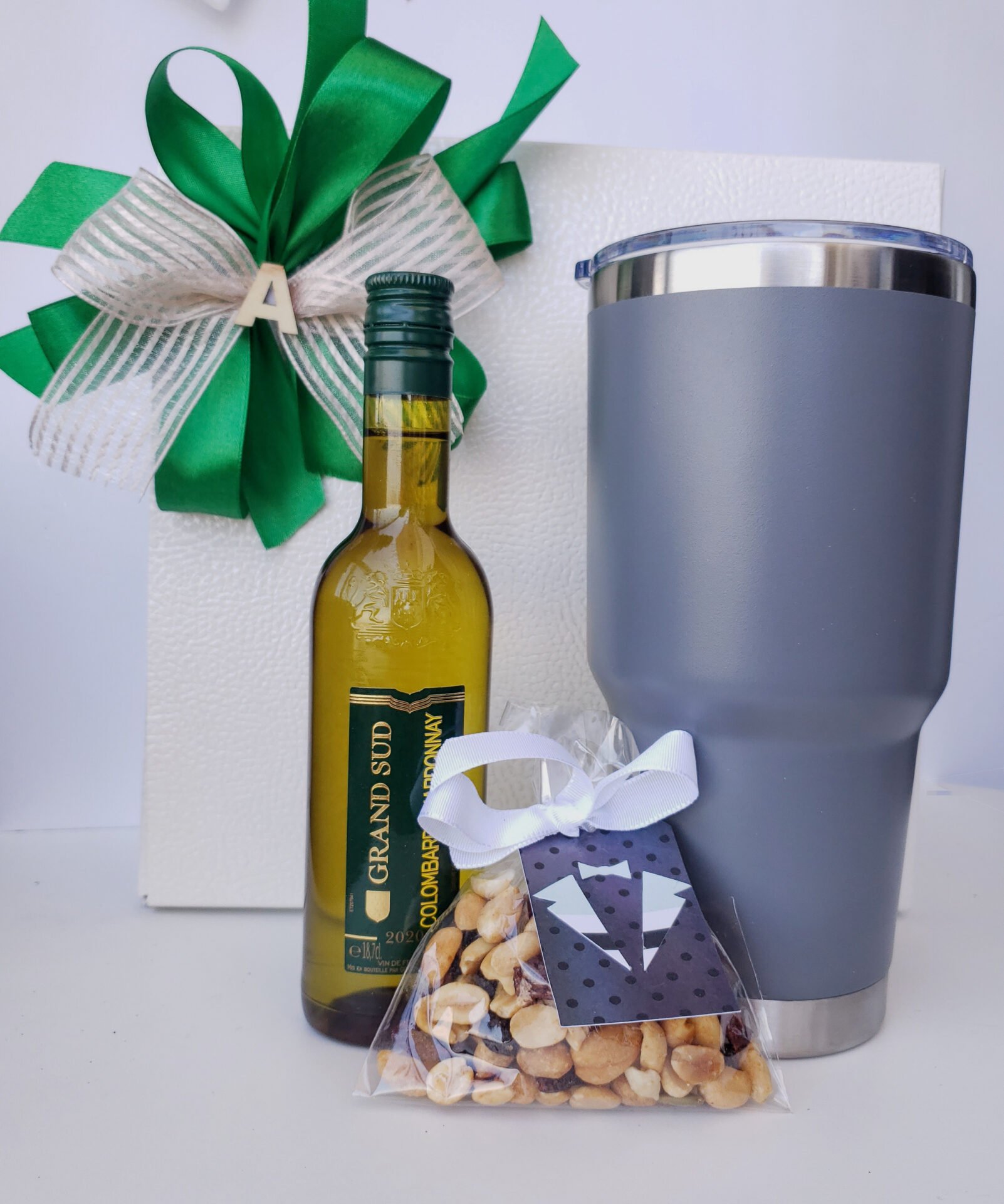 Set de vaso termico personalizado en vinil, mini vino y bolsita de frutos secos en caja perlada y decorada.