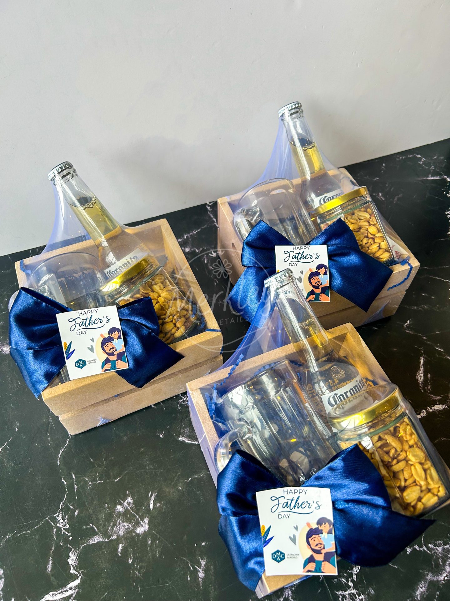 Set de cerveza, jarra y frasco de frutos secos en cesta.