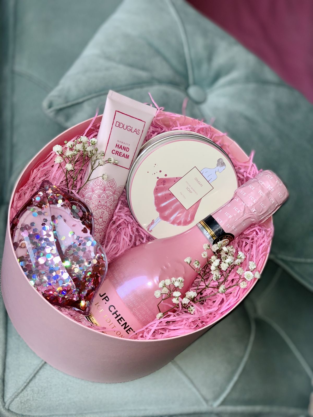 Mini espumoso, crema de manos, jabón facial espumoso y sales de baño.