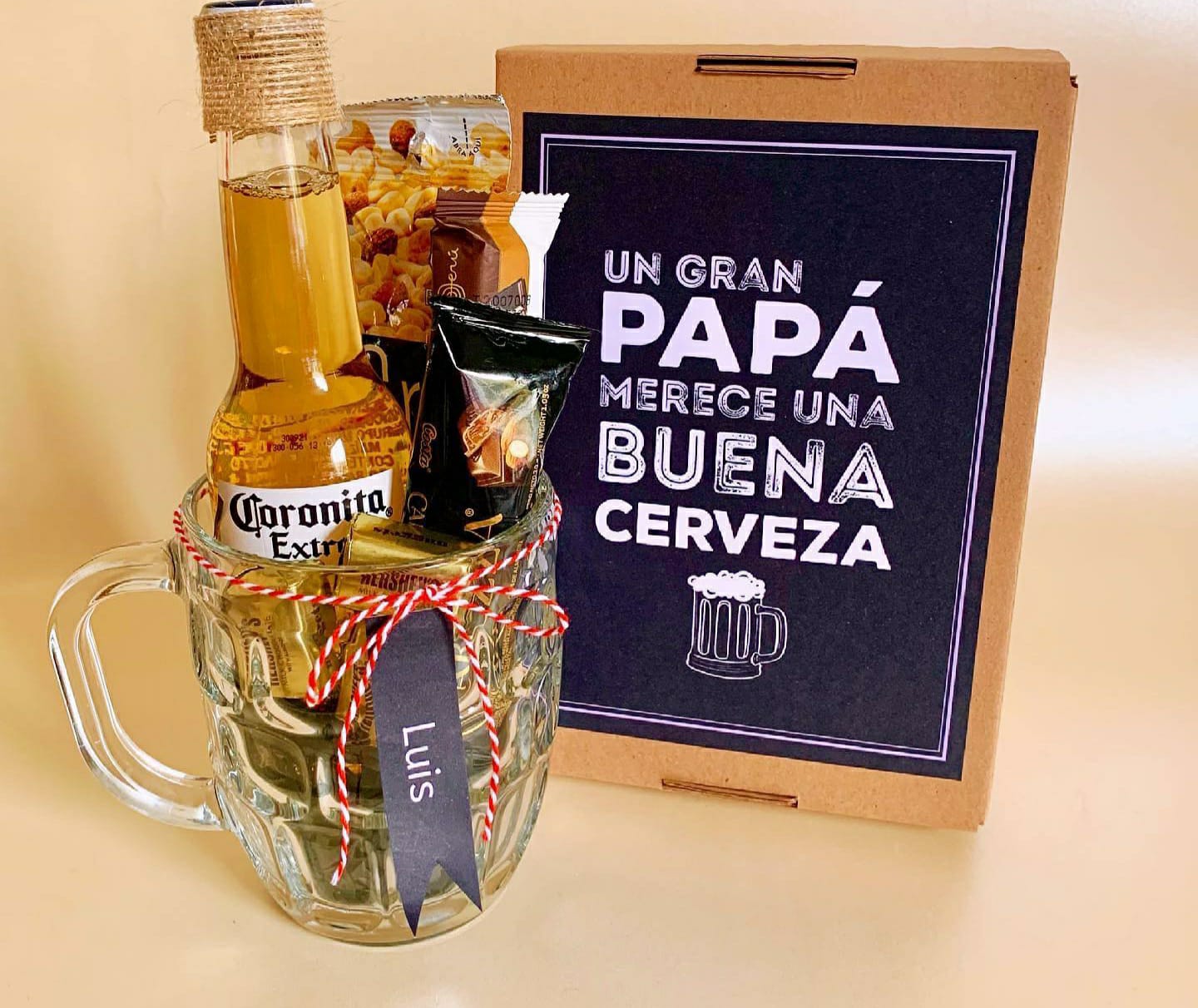 Jarra cervecera con chcolates diversos y mini bebida.