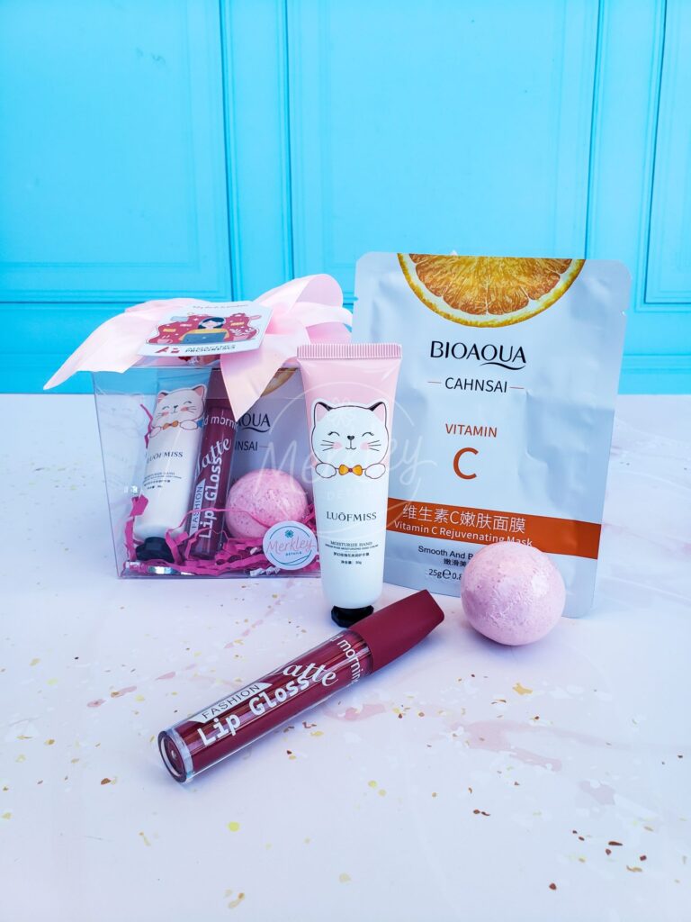 Mascarilla, brillo de labios y bath bombs, y crema de manos.