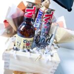 Cesta de madera libreta de apuntes, taza personalizada en vinil adhesivo y cajita con kisses.