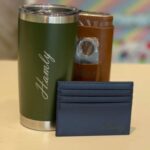 Caja cartón, vaso térmico personalizado en vinil, chocolate, porta vaso de madera, whisky imperial.