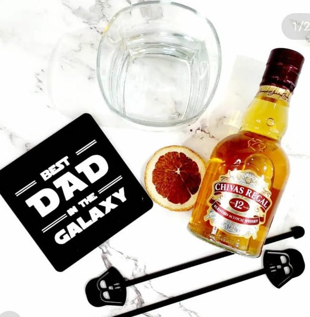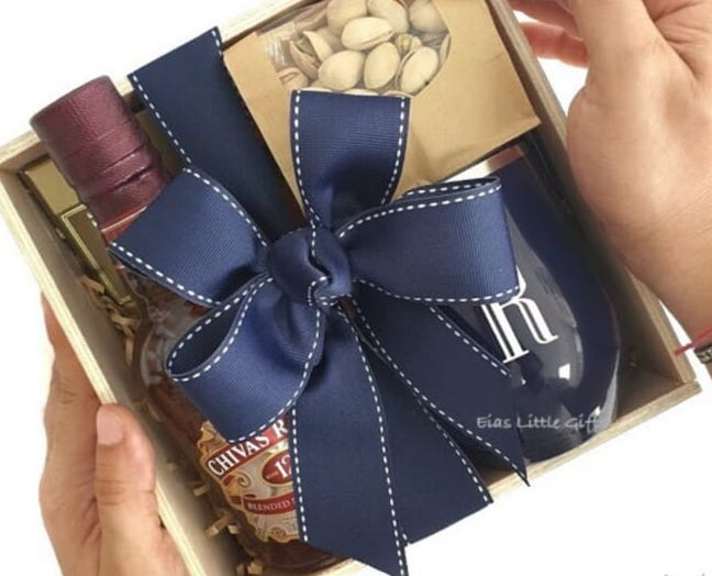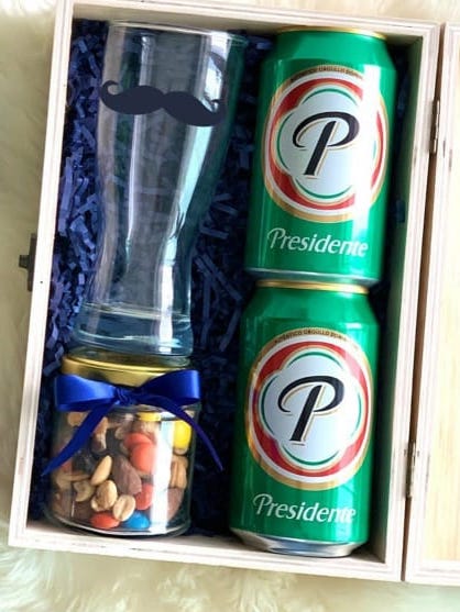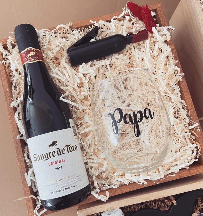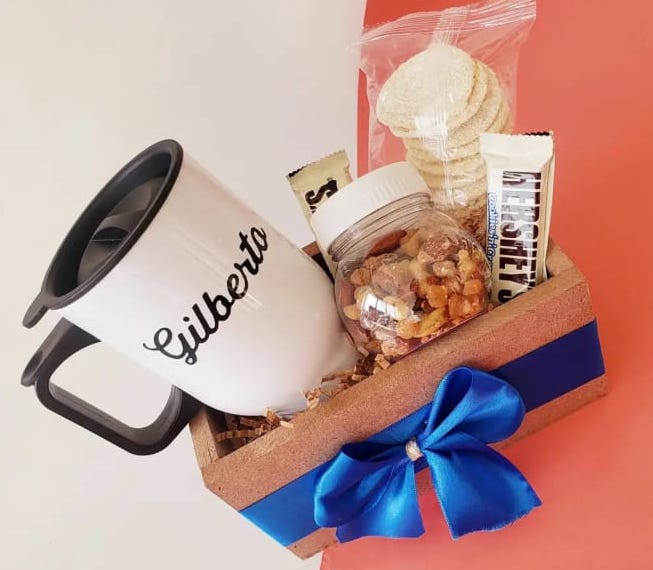 Cesta de madera con jarra cafetera personalizada en vinil adhesivo, bolsa de casabitos, frutos secos y...
