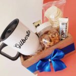 Cesta de madera con jarra cafetera personalizada en vinil adhesivo, bolsa de casabitos, frutos secos y...
