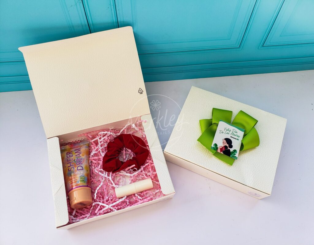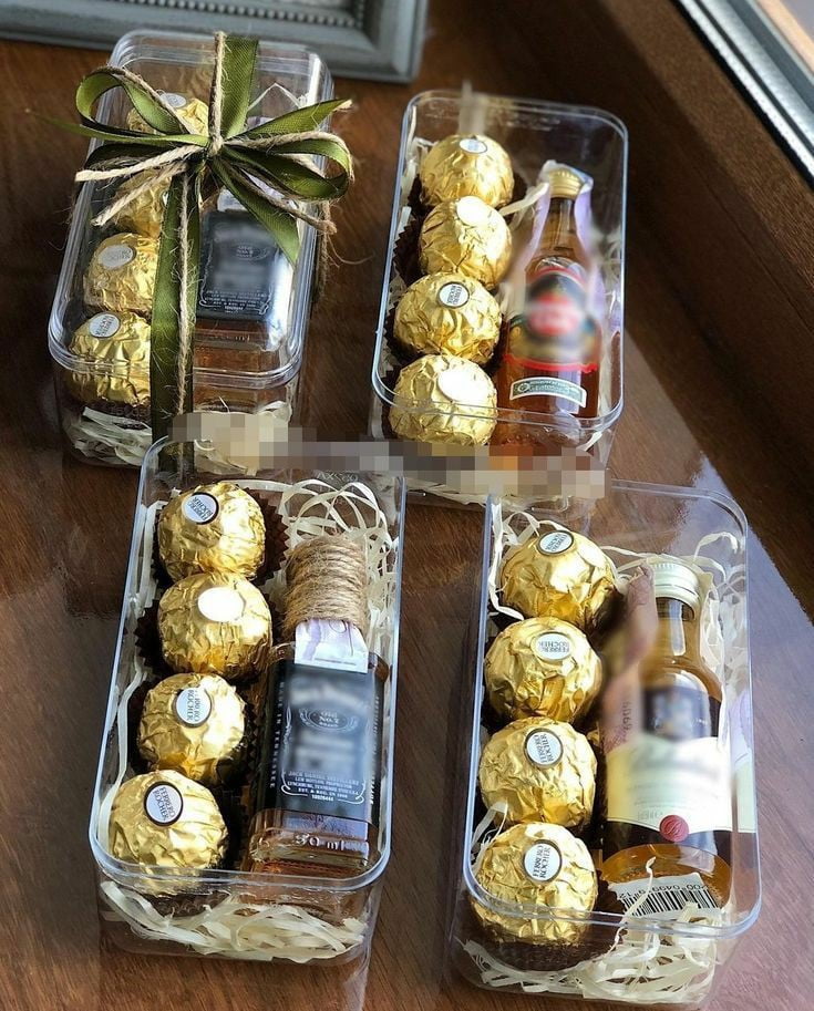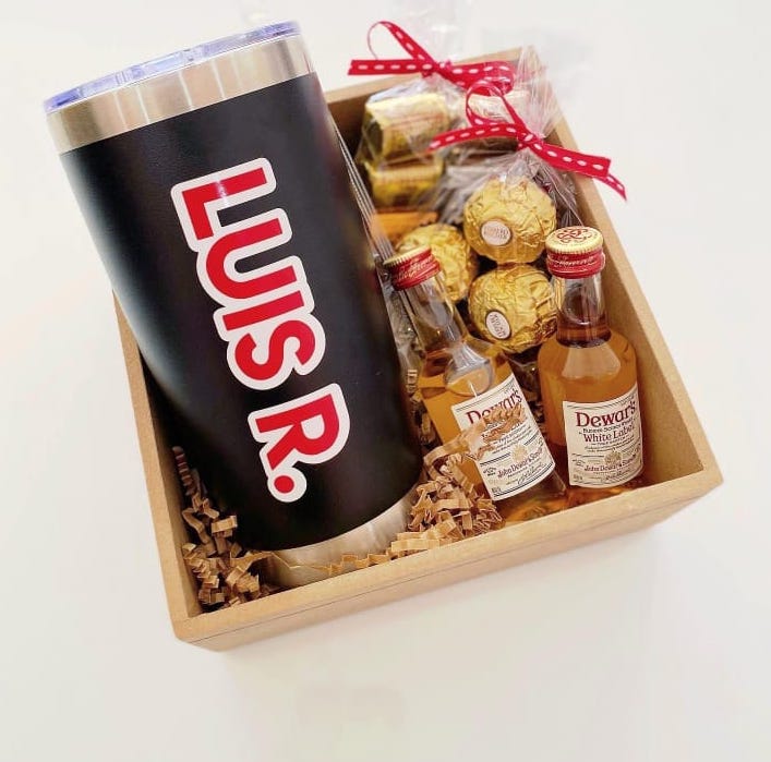 Vaso termico personalizado en vinil, mini bebida, bombones ferrero rocher y hersheys nuggets en base madera.