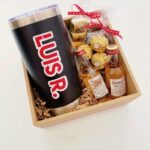 Vaso termico personalizado en vinil, mini bebida, bombones ferrero rocher y hersheys nuggets en base madera.