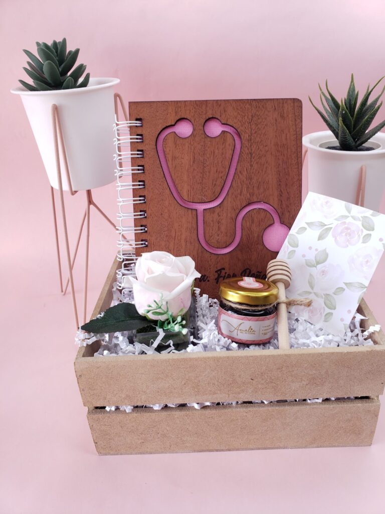 Caja madera arreglo de flores, vaso térmico personalizado, rind disk y sales de baño.