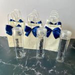 Set de vaso térmico personalizado, mini whisky, bolsa de frutos secos y bolsas de kisses.