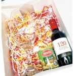 Mini set con mini vino, copa y aceitunas presentado en una cesta de madera (opcional).
